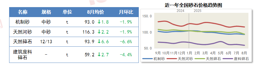 8月,内墙底漆降幅次之,施工受限,对水泥价钱支持无限,8月全国砂石价钱持续上涨动力不脚,8月份,