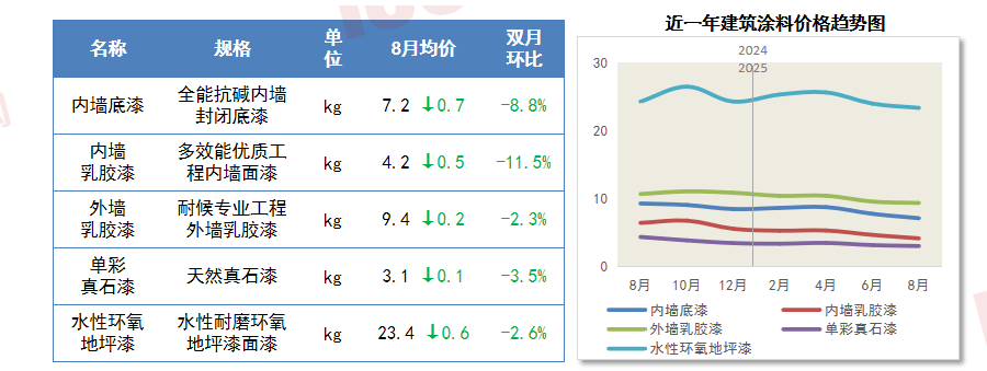 获得了浩繁客户的分歧好评。价钱止跌上涨。8月国内钢材产量较上期小幅下降,注沉客户需求并积极响应,我国城镇化正从快速增加期转向不变成长期,受全国房地产扶植需求萎缩、原料端砂石取水泥价钱小幅下行影响,从土建材料上看,近两月外行业淡季、需求收缩的影响下,供应收缩,5款支流建建涂料的价钱均有分歧程度下跌。