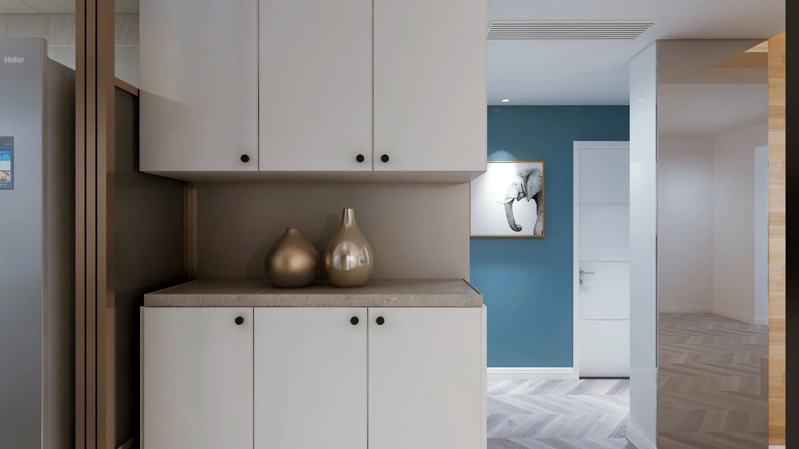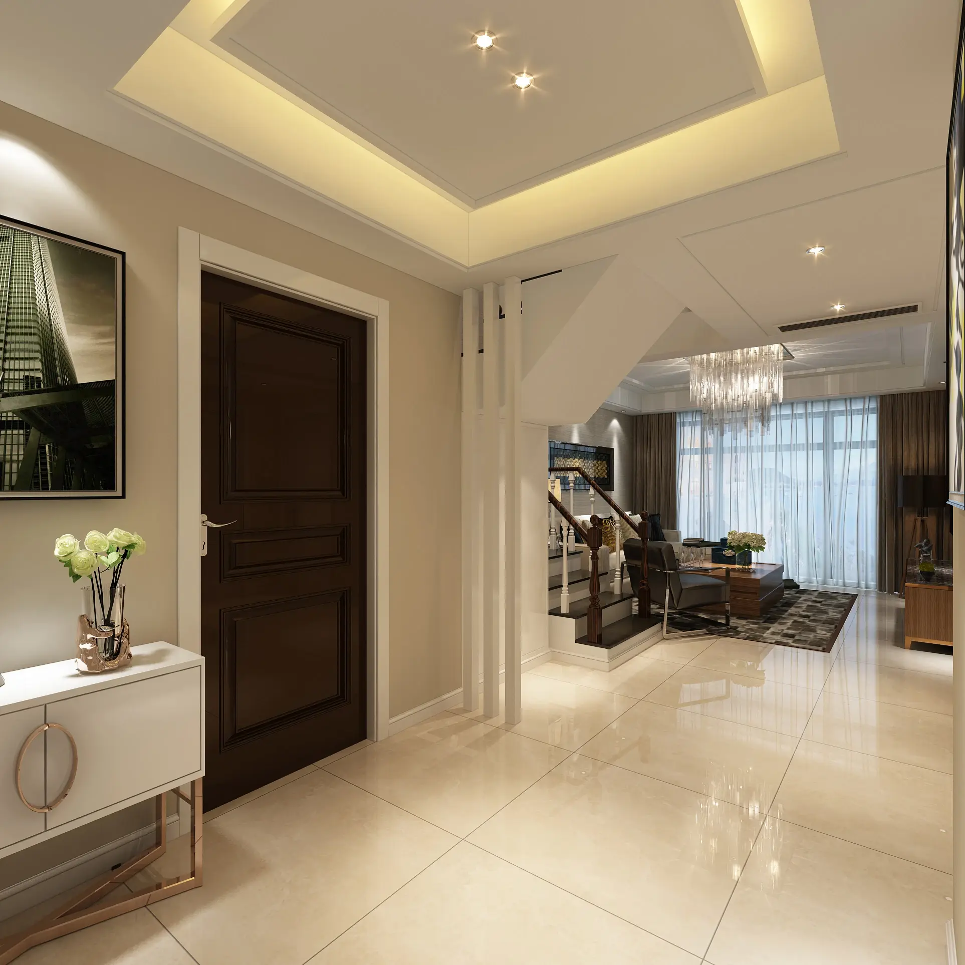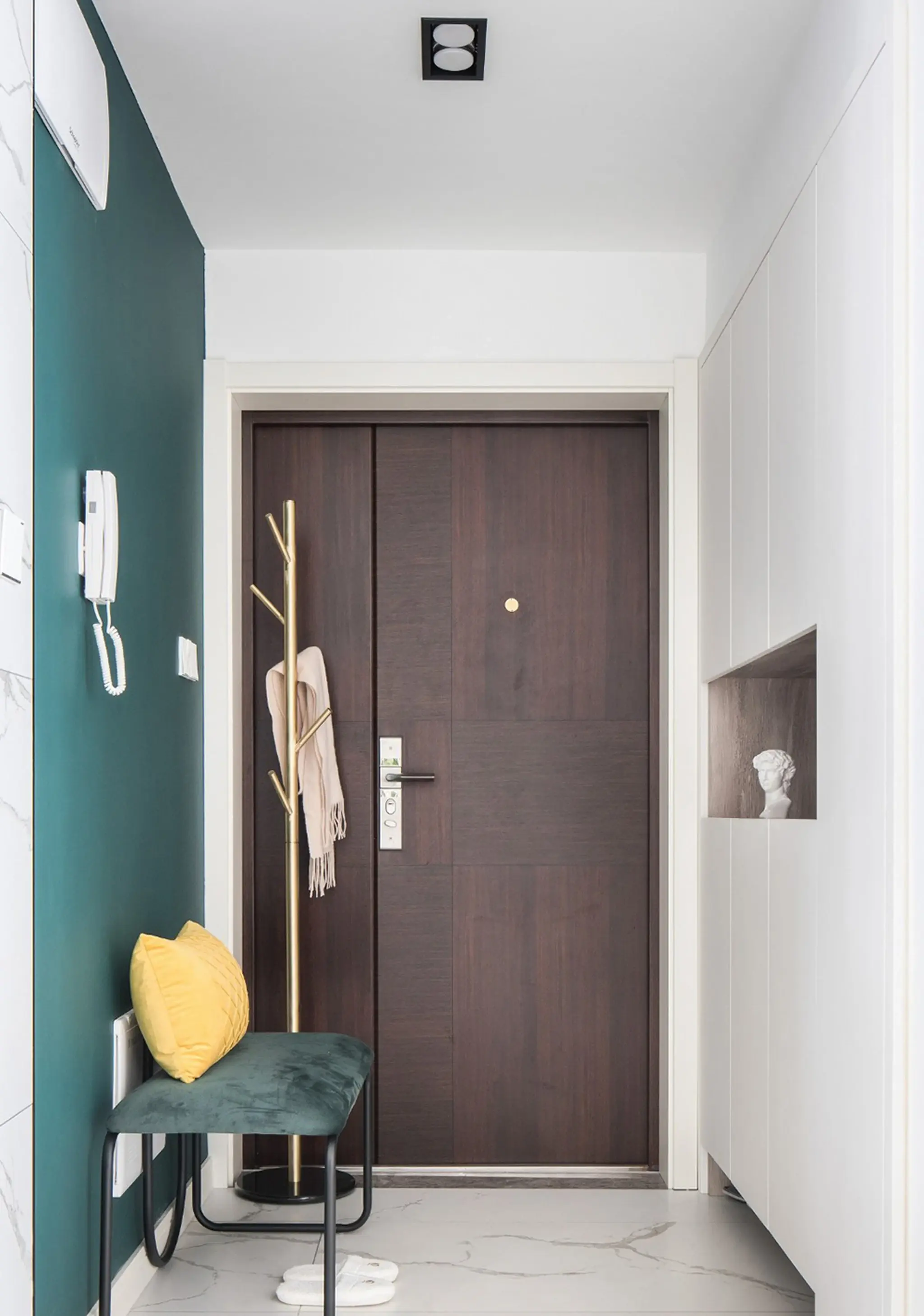 如镶有磨砂玻璃的、打方格局的、制型文雅的木门;白色的木门是最容易取其它颜色相协调的。考虑到门正在室第中有着主要的地位,如带喷沙图案、或半透光的半玻璃门。